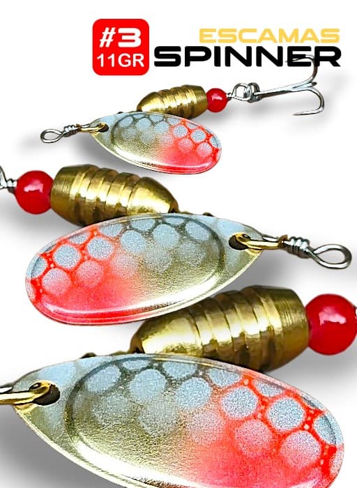 Spinner con diseño o patrón de escamas con fondo rojo neón, señuelo atractor de truchas grandes.