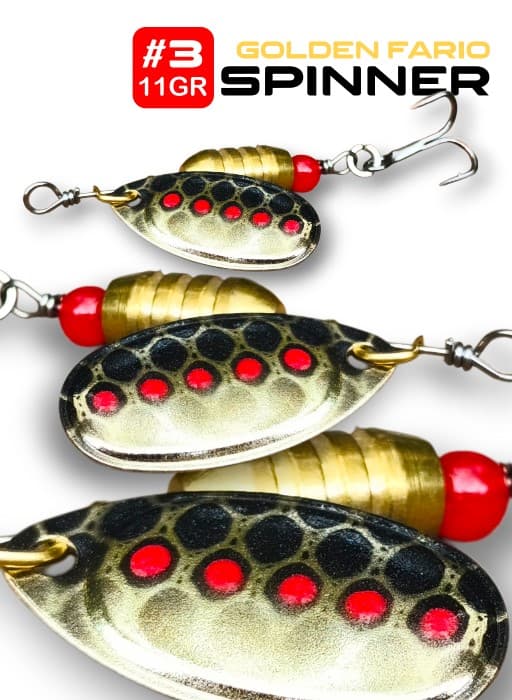 Spinner con diseño o patrón de escamas con puntos rojos, señuelo atractor de truchas.