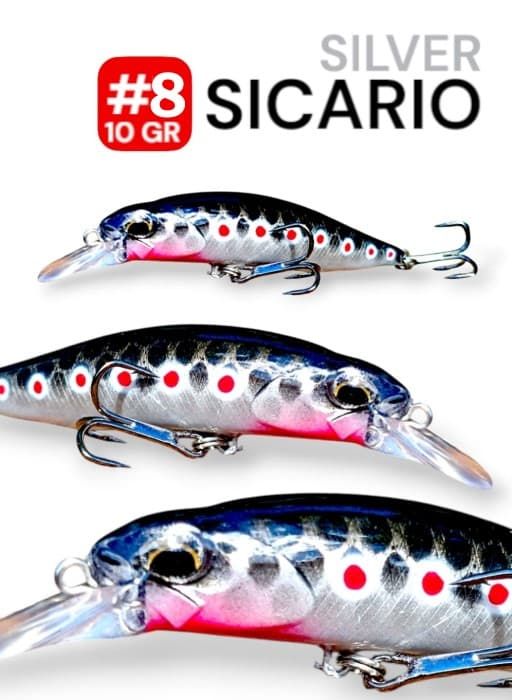 Minnow Sicario Plateado 8cm  - 12gr.Señuelo tipo Minnow de color Negro y Plata, con puntos Rojos, ideal para la pesca de truchas grandes en río y lagos. Su acción es Sinking Slow.