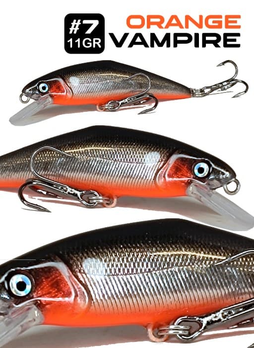 Señuelo tipo Minnow Plateado, lomo Negro y Costado plateado, guata naranja, paleta nado frenético. Señuelo Sinking